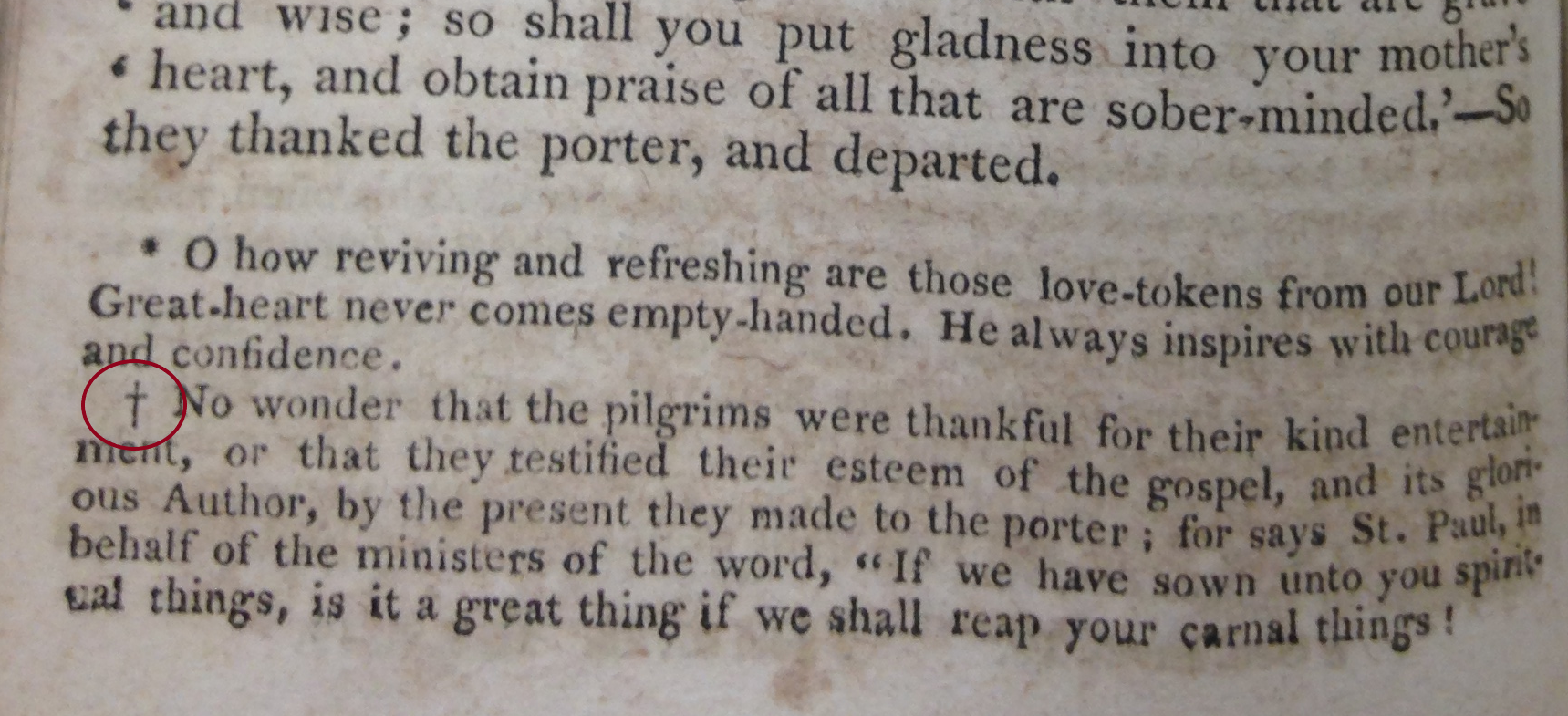 Fig. 8.16: dagger symbol for footnote, (ring added), in John Bunyan, , 1678 , illustration by Early Novels Database, Flickr, <https://www.flickr.com/photos/97741188@N04/14489825415> [CC BY 2.0, accessed May 2025]