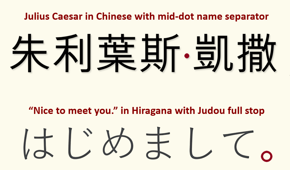 While Chinese doesn’t use punctuation marks to the same extent as phonetic scripts, it did develop its own punctuation system centuries ago known as jùdòu (句读). For example, the centred dot (·) is still used to mark phonetic divisions within words and separate first and last names translated from foreign languages. Special marks were used to indicate a stop such as () or (), or simply a blank space. Otherwise, the special characters 夫, 维, 且, and 盖 could be used as sentence-beginning particles (similar to English discourse markers like "now... or "firstly..."). Similarly, characters such as 兮, 也 or 矣 could be used as sentence-ending particles. Today, Chinese and Japanese use the jùdòu mark () as a full stop, and () as a comma (to separate items in a list only). Japanese and traditional Chinese use double and single rectangle quotation marks (/) (horizontal), but simplified Chinese has imported the Latin variant (“ ”).⁴³ ⁴⁴ Korean now mostly uses Latin commas for quotations, but traditionally used angled brackets (/) for titles and headings.⁴⁵