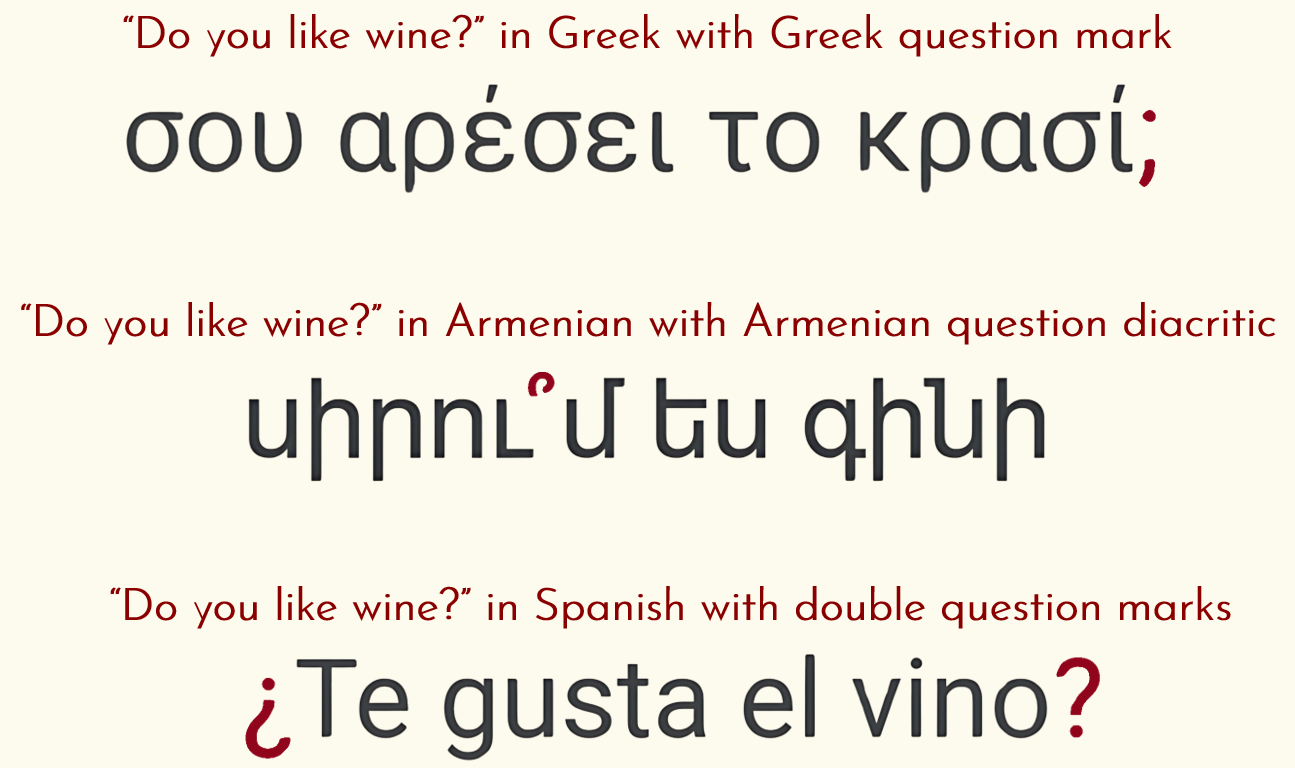Whatever the real story, different languages adopted the modern Latin question mark at different times, and by the 20th century, it was more or less a global standard. Exceptions to this include modern Greek, which uses a semi-colon (;), standardised around the same time as the Latin question mark, Ge’ez which uses three dots (፧), and Armenian which uses the diacritic mark () placed above the stressed vowel of the question word.³⁰ Spanish is also notable for its use of double question marks, one inverted opening and one regular closing at the end (¿…?).