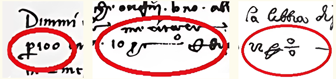Fig. 8.21: historical percentage symbols, in David Euguene Smith, , Boston Ginn, 1908, pp. 439-441, sourced from Wikipedia, <https://en.m.wikipedia.org/wiki/File:Percent_sign_in_1648.png> [public domain, accessed April 2025], Wikimedia Commons, <https://commons.wikimedia.org/wiki/File:Percent_sign_in_1339.png> [public domain, accessed April 2025], Wikimedia Commons, <https://commons.wikimedia.org/wiki/File:Percent_sign_in_1425.png> [public domain, accessed April 2025]